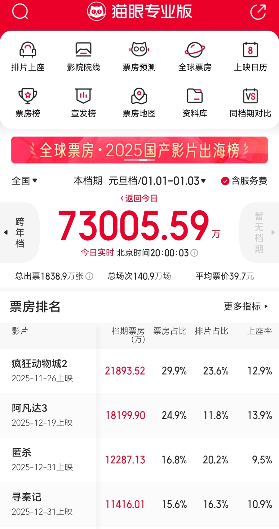 据猫眼专业版数据,截至1月3日16时03分,2026年元旦档档期(1月1日-1月3日)总票房破7亿元,《疯狂动物城2》《阿凡达3》《匿杀》分列档期前三位。档期内共有四部影片破亿,分别是《疯狂动物城2》《阿凡达3》《匿杀》和《寻秦记》。其中《疯狂动物城2》以超2亿元的档期票房一路领跑,票房已超过42亿元,距离影史进口片票冠的《复仇者联盟4》42.5亿元的成绩仅有一步之遥。截至1月3日20时,档期总票房超7.3亿元,上海暂列元旦档城市票房冠军。